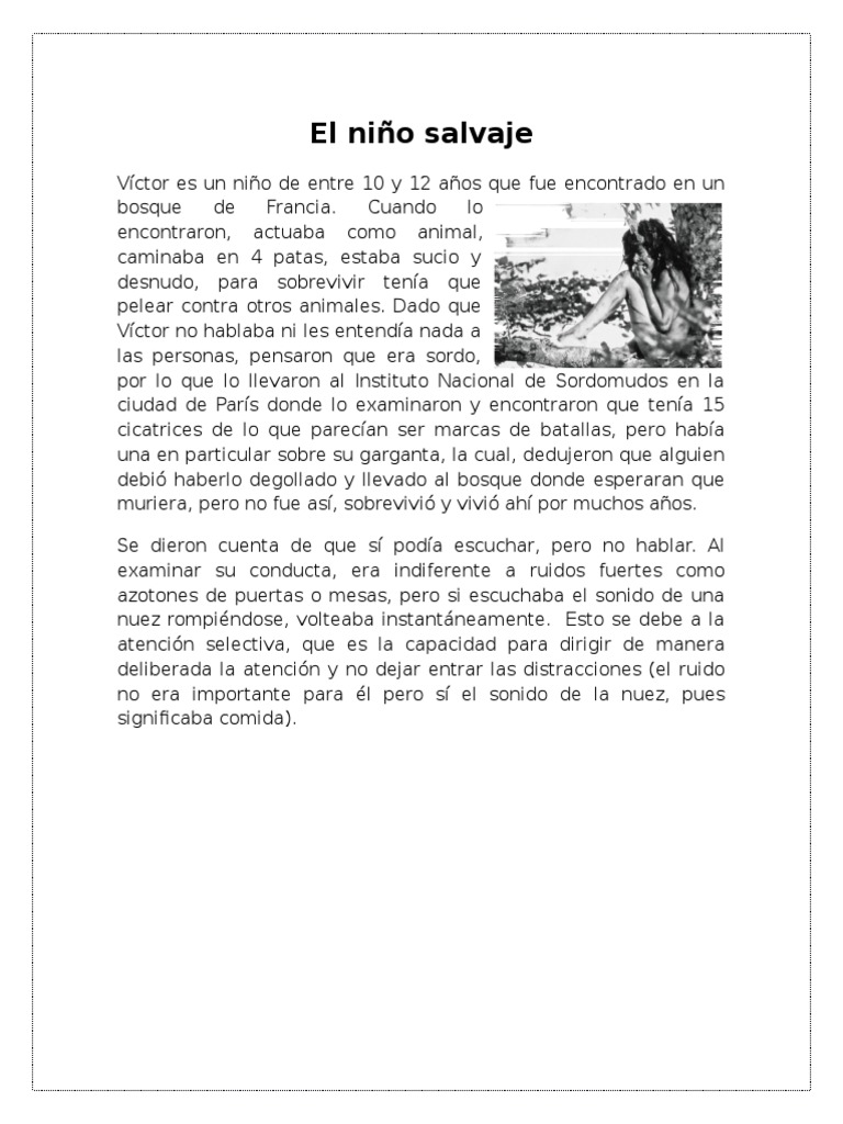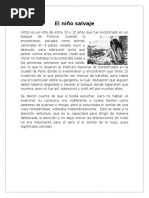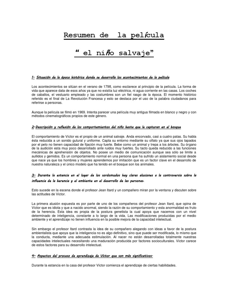 SinopsisEl pequeño salvaje es una película de François Truffaut basada en la vida de Víctor de Aveyron un niño encontrado en la década de 1970 en un bosque cerca de Toulouse Francia. En 1799 tres cazadores encontraron en los bosques de Caune en la región francesa de Aveyron cerca de los Pirineos. 4058 palabras 17 páginas.